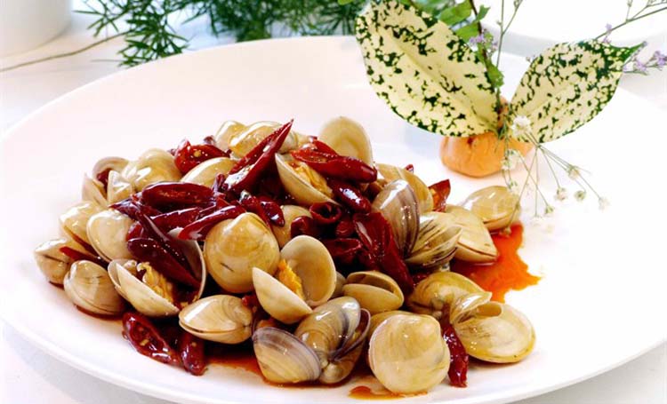 8.加水淀粉勾芡,这样蛤的汤汁可以吸收了,炒好装盘即可。