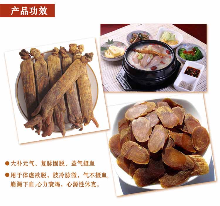 高丽参有大补元气、生津安神等作用,适用于惊悸失眠者,体虚者,心力衰竭、心源性休克等。现代医学研究显示,高丽参有多种滋补效能。日本和韩国学者经研究发现,高丽参在预防糖尿病,动脉硬化,高血压等方面有明显效果,高丽参还有抗癌,控制疾病,促进血液循环,防止疲劳,增强免疫力等方面的功效。
